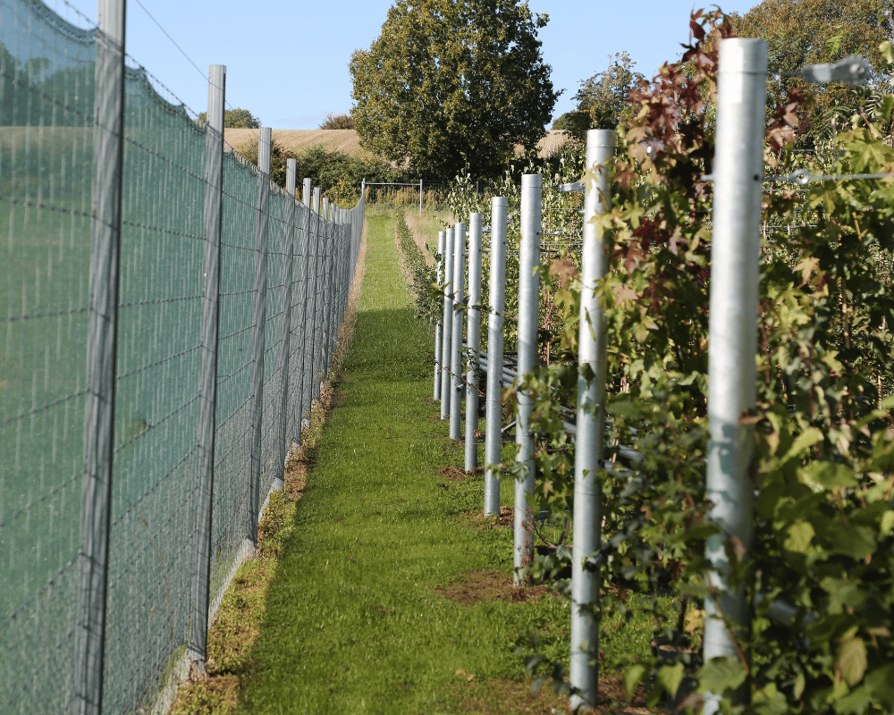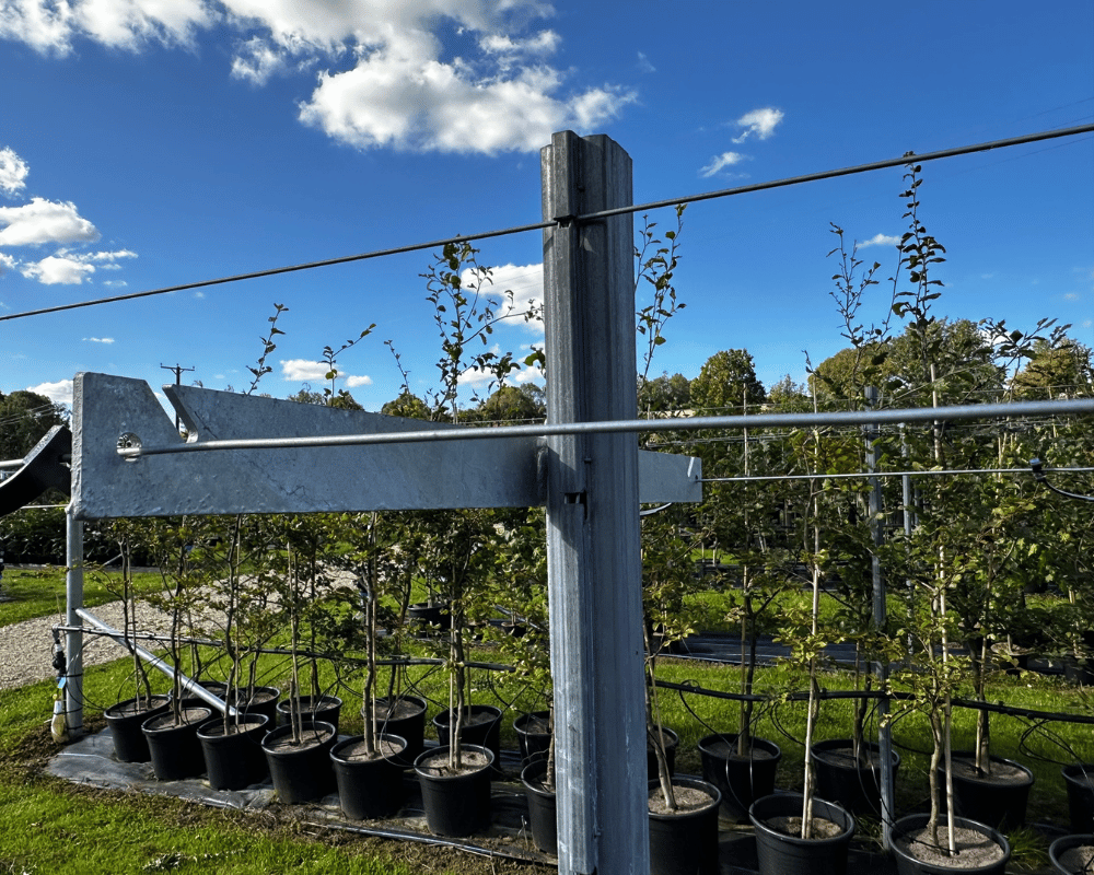 The main framework is constructed from Fetra strainers and intermediate posts, which were installed by one of our recommended contractors, James Corbett. Custom bolt-on T-bars create double line wires spaced approximately 300 mm apart, which can be positioned low for young stock and raised as the trees develop to around 2 metres.
